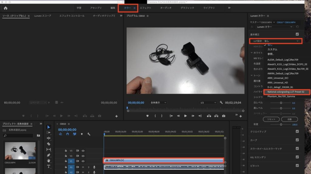 シーケンスからLUTを適用したい動画を選択しておきます。