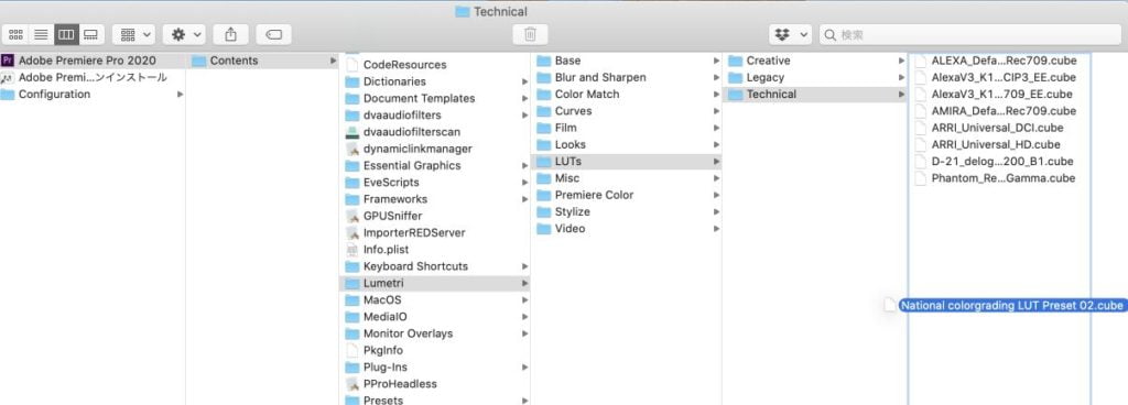 パッケージが展開されたらContents→Lumetri→LUTs→Technicalを開き、LUTファイルを放り込んでPremiere Proを再起動してください。