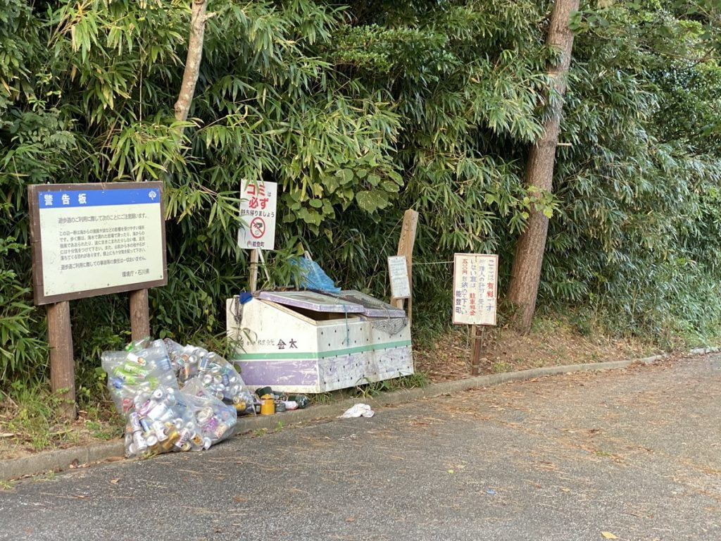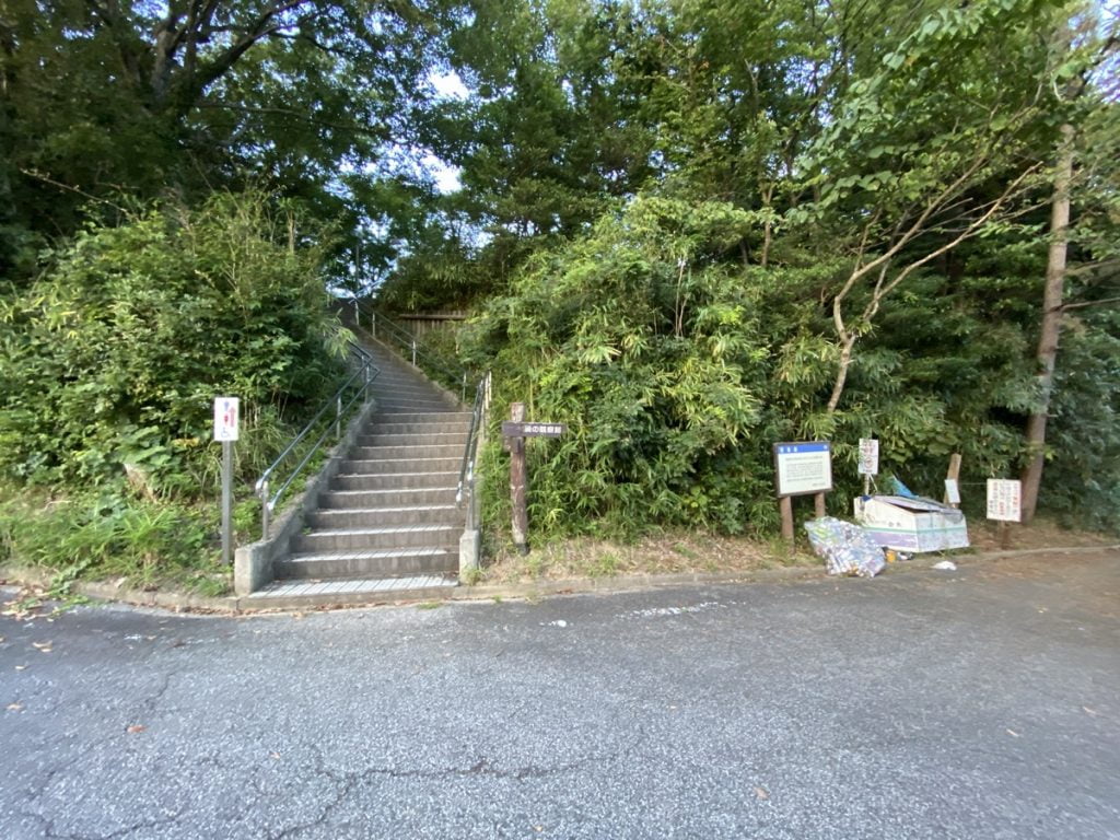 ▼芝生広場サイト入り口の斜面。ゴミ捨て場あり。