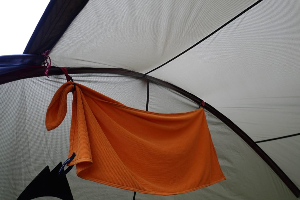 濡れたタオル類をテント内で干して…地味にハバツアー2はフックが多くて便利です。