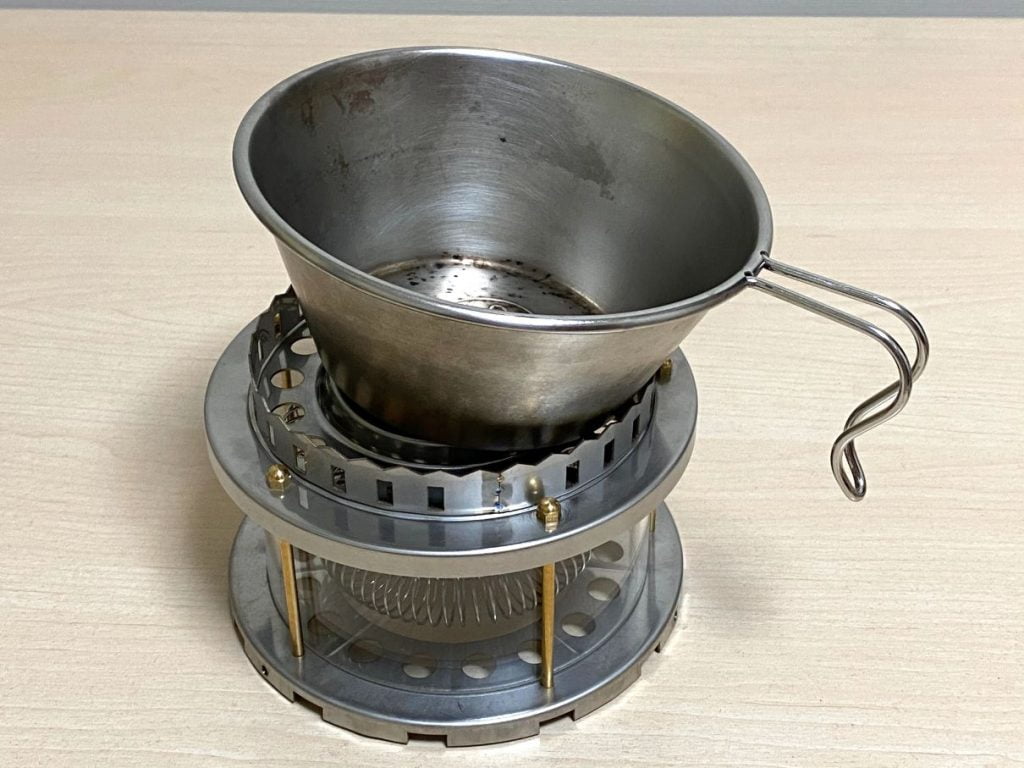 ▼シェラカップやソロ用の小型クッカーのような、底面積の少ない鍋だと上に置けません。