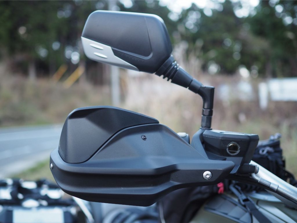 純正ミラーとハンドガードはアドベンチャーの巨体と比較するとスリムすぎたので、見た目の調整で交換しました。