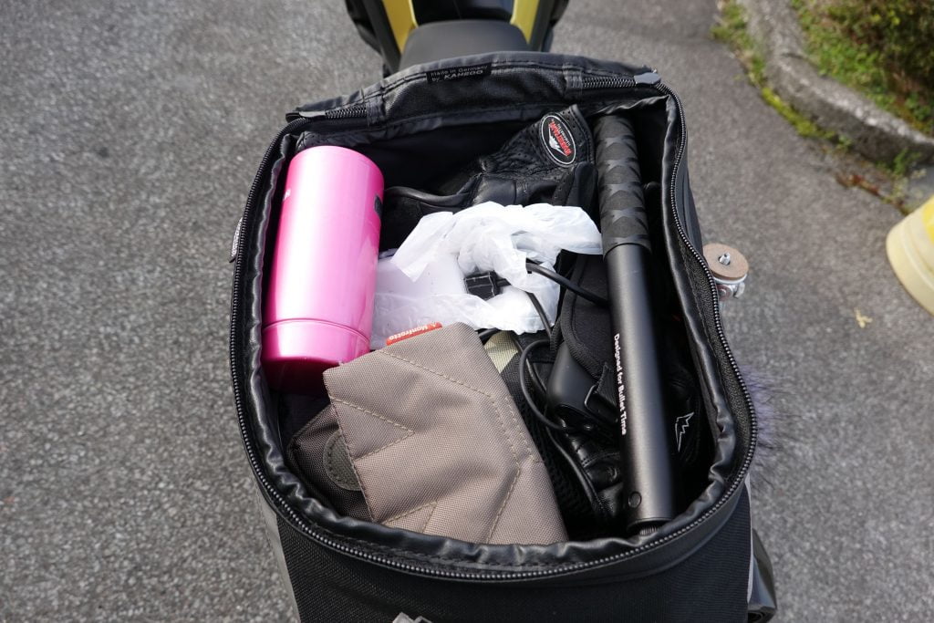 絶対容量は少ないので普段はリュックを背負ってますが、そもそも日帰りツーリングの場合、リュックの中はほぼ空です。